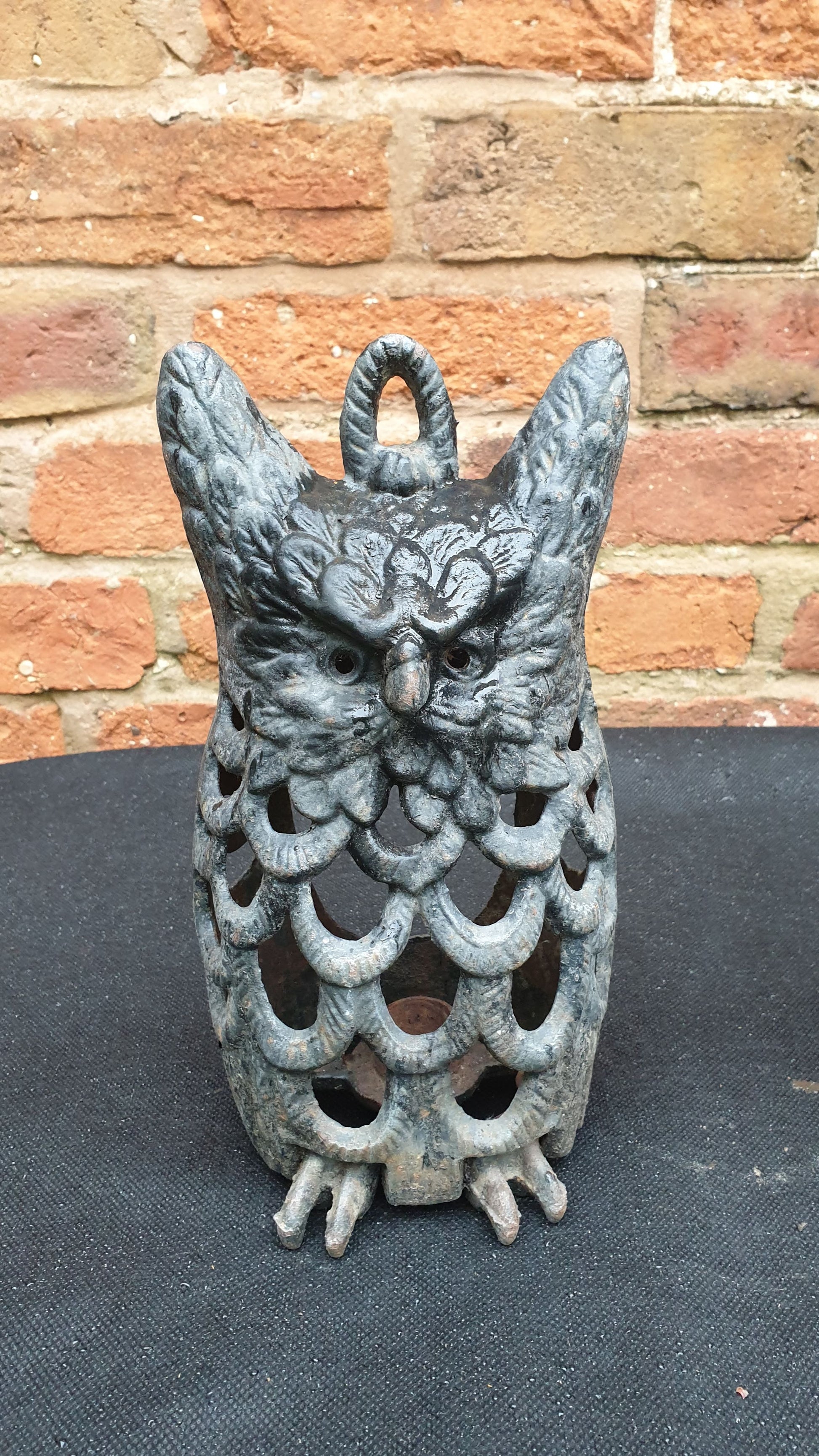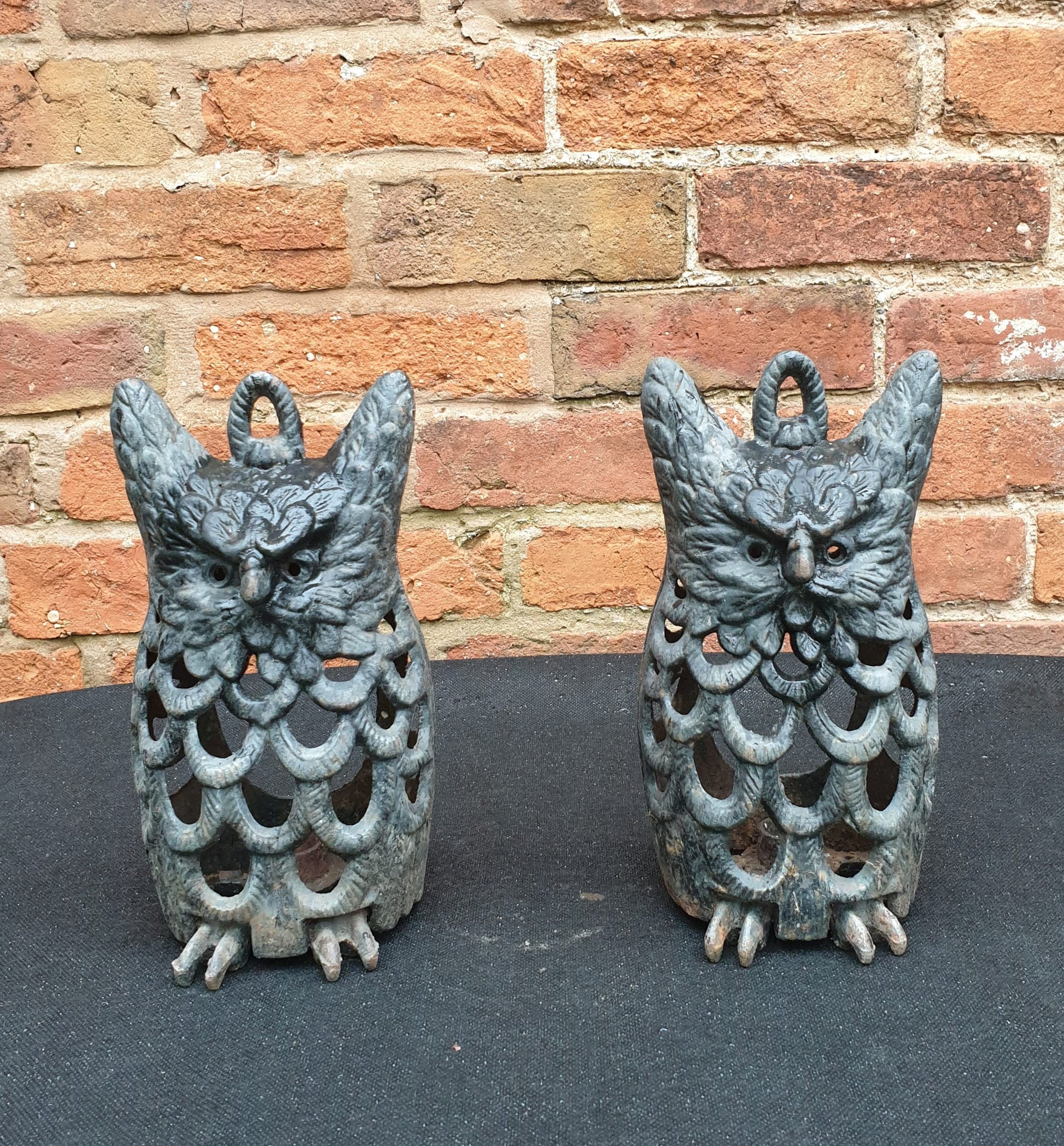 Pair of charming vintage cast iron owl lantern/candle holders to give your evening in the garden a warm glow. These are 10inches tall and approx 5inches wide and definitely wont blow over, they are very heavy.