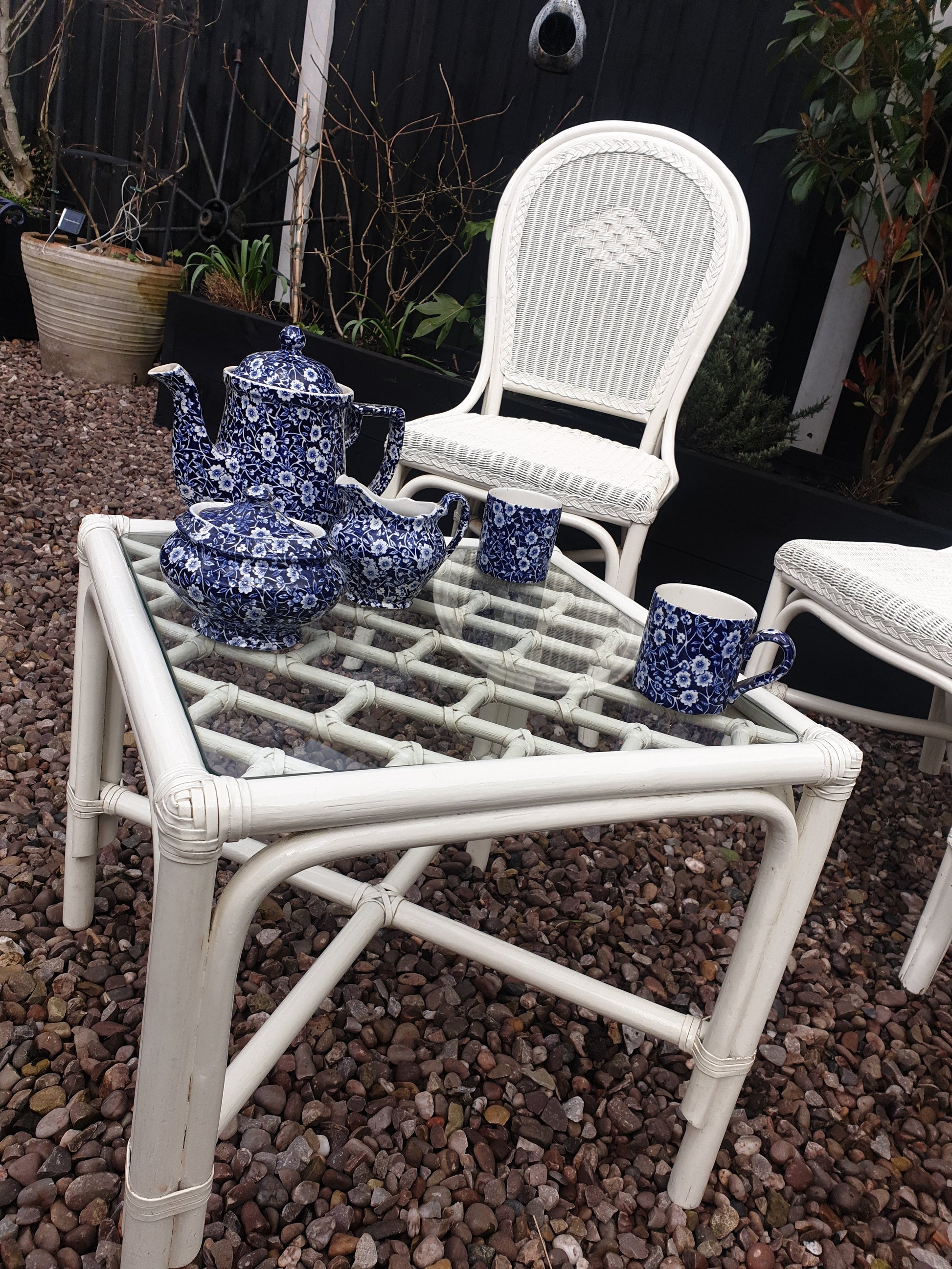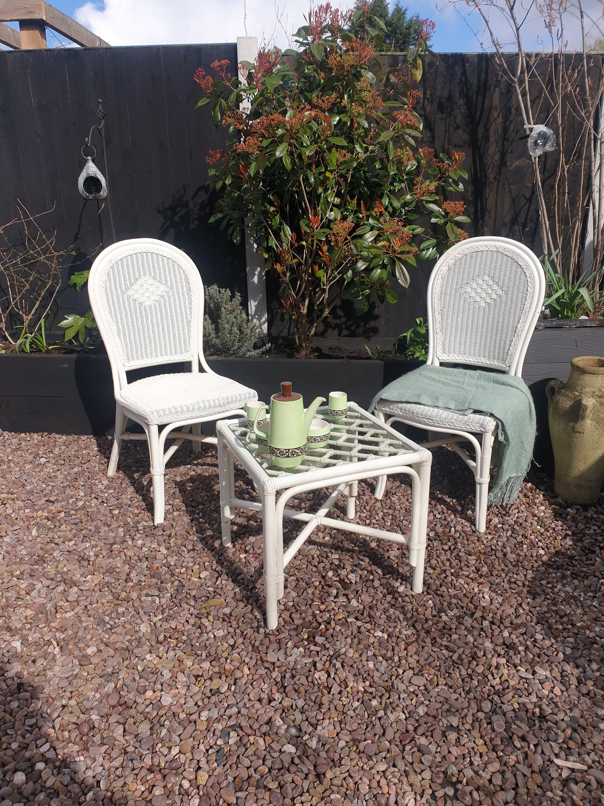 Vintage white rattan and bamboo garden, summerhouse or conservatory set. Three chairs plus a glass topped coffee table, in excellent condition. Thought to be from the 1970s, this has stood the test of time, a classic little set.