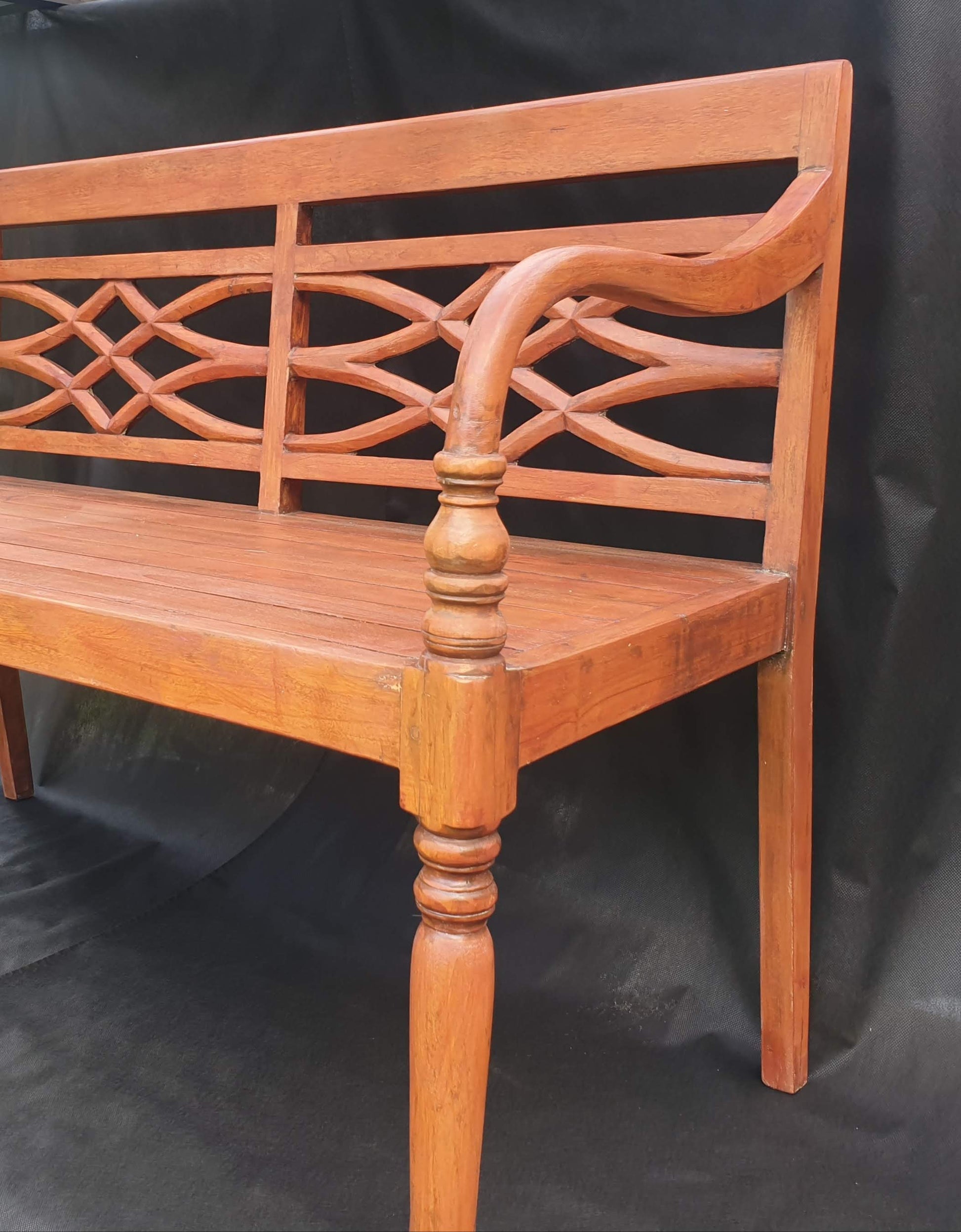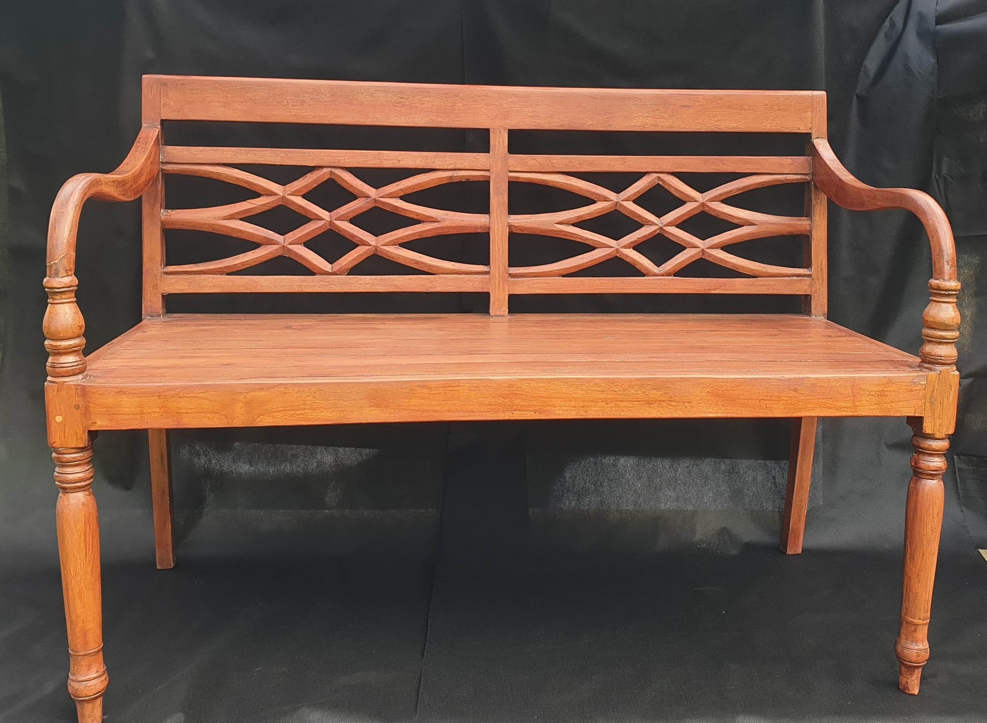 A perfectly formed small bench with a lovely back rest that would look great in a kitchen, this had been brought back to life after a very grubby start, its been stripped, repaired, stained and waxed. I would suggest keeping it covered if you are going to leave it outside all year.