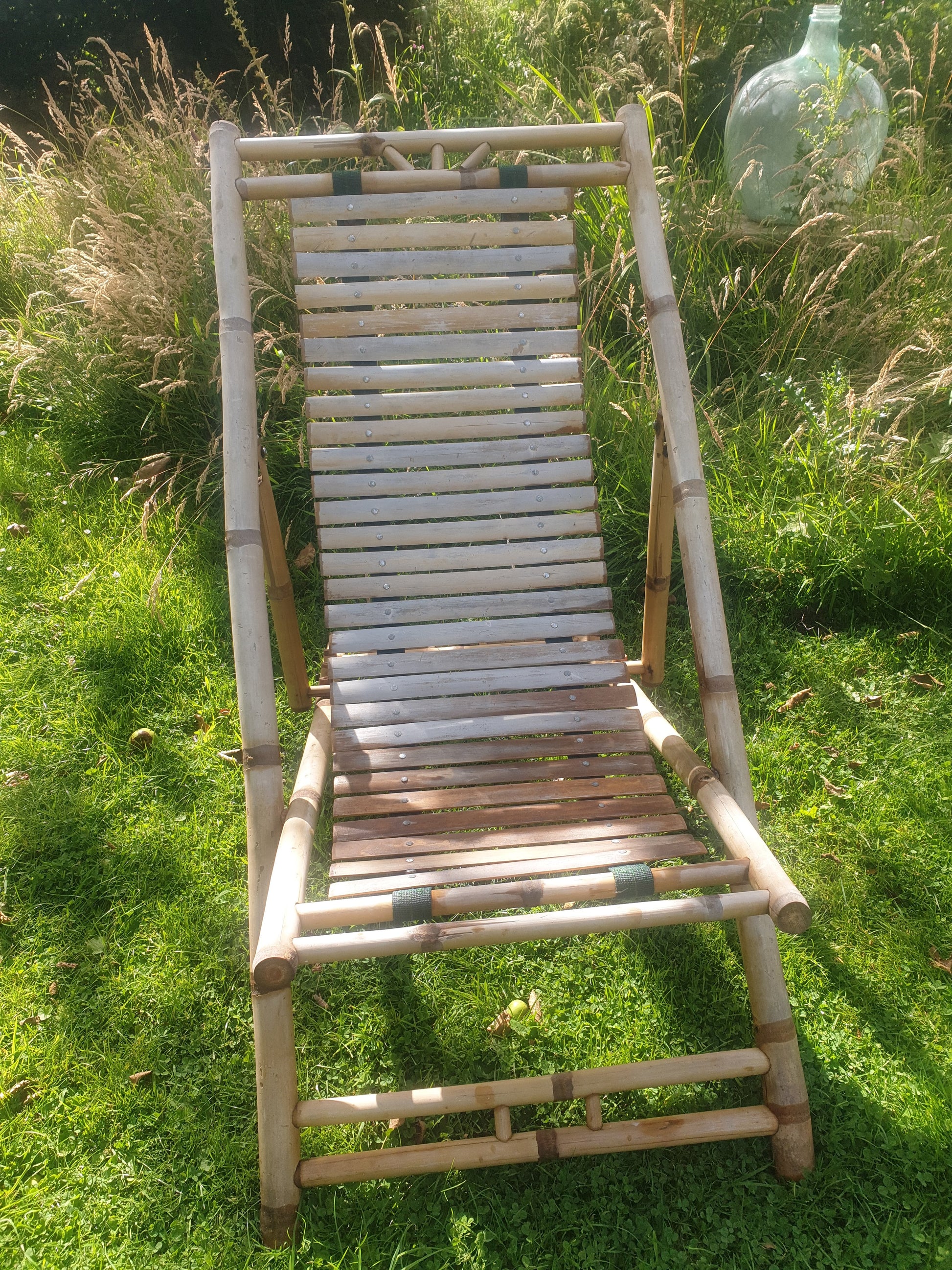 A pair of I believe Vietnamese folding bamboo deckchairs. These are in great condition and are actually very comfortable. They would look especially good on a deck I think but wherever you put them they will be a statement. They come as a pair, I dont think you will find many others like this.