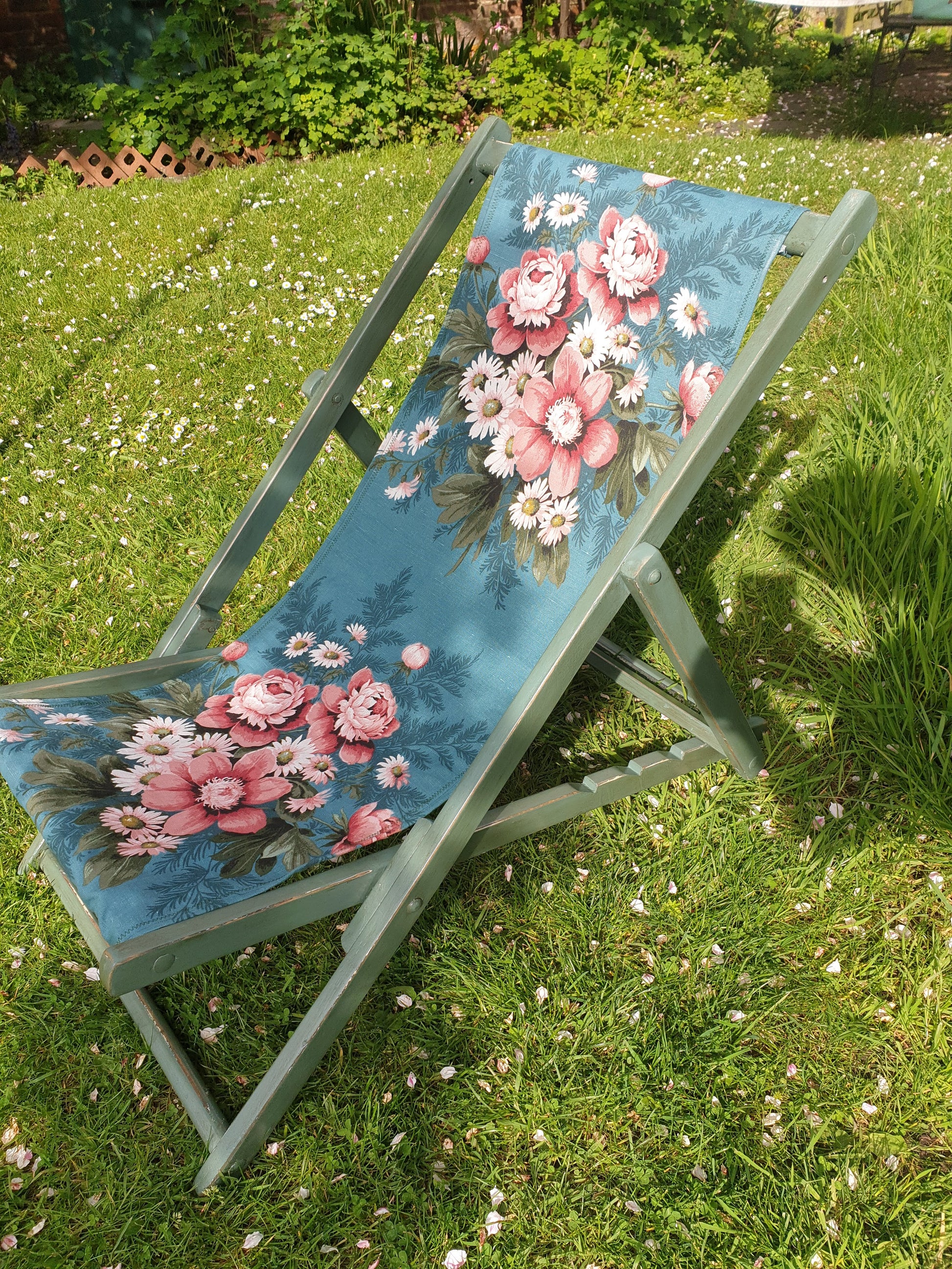 A pair of beautiful upcycled and restored folding wooden deckchairs. They have been sanded, painted and aged and had new seats using new original vintage Sanderson floral fabric. The original seat material has been washed and sewn into the new fabric for strength. These will look just perfect on a deck, patio or lawn and are they ideal place for a sunny afternoon snooze or to relax and listen to the birds. They come as a pair but are not weatherproof so I suggest that they are not left out in wet weather. Always ensure they are set up properly before you sit down and dont have your fingers caught in the frame.