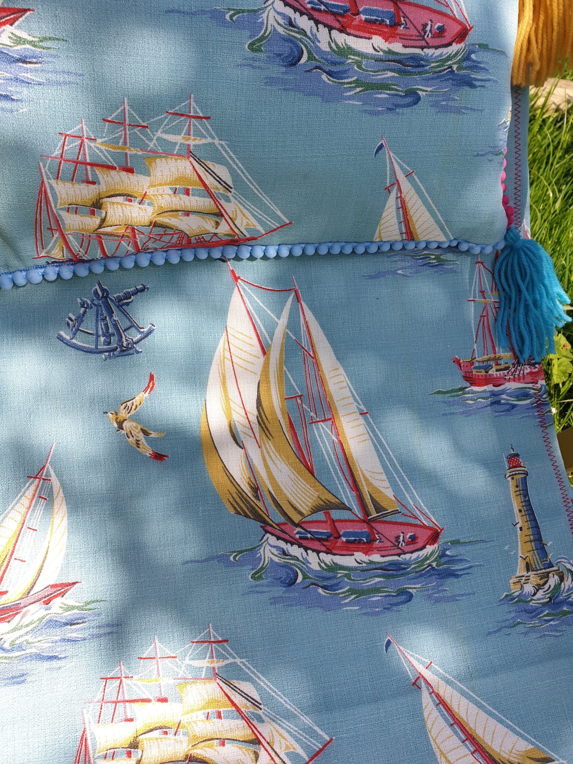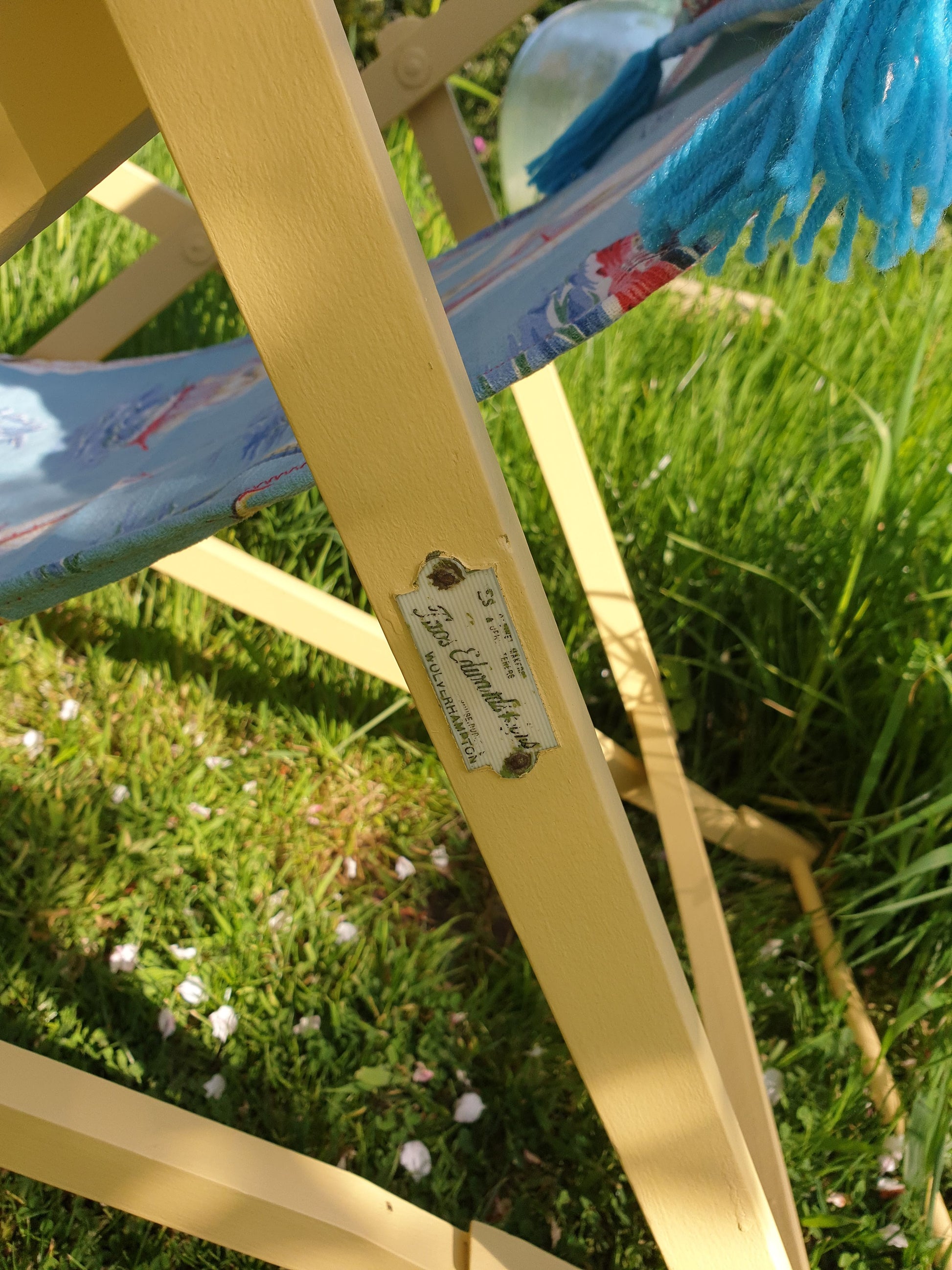 A stunning transformation for this vintage wooden deckchair, painted in a pale mustard yellow with s new seat made from vintage sailboat fabric. The original seat fabric has been sewn inside for extra strength and comfort, and there is a small tie on cushion for your head. This is a one off and extremely comfortable, perfect for a relaxing afternoon nap. I have been a little more generous with the material width wise to make it more comfortable.