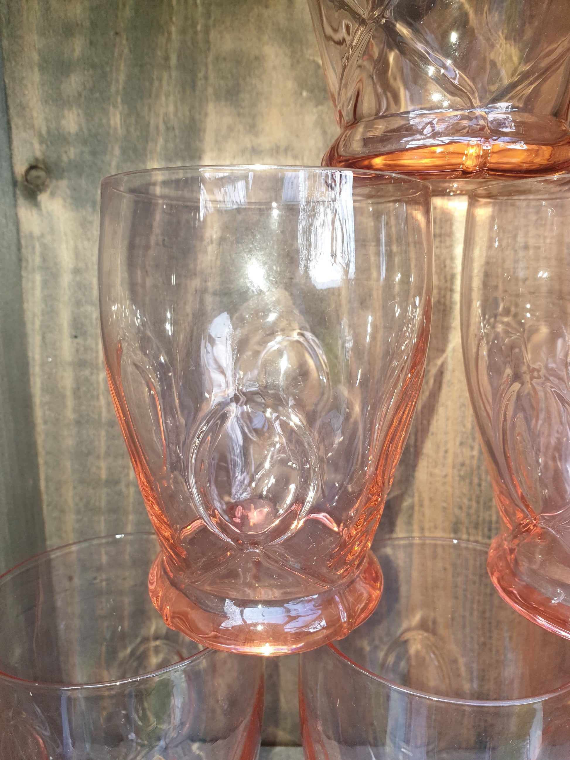 A really beautiful vintage pink glass jug and tumbler set. This really says summer, add ice and fruit and your favourite refreshing drink and sit back and enjoy the sun.